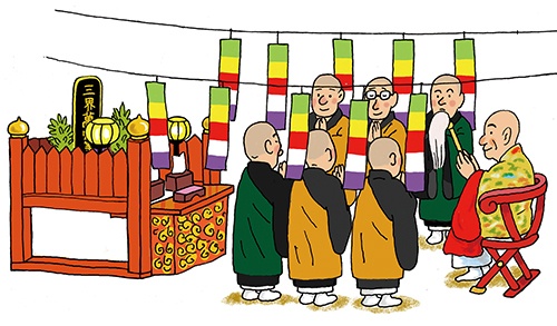 餓鬼道に堕ちた目連尊者の母を助けるためにお施餓鬼をし、それに対しての功徳として、ご先祖様を通してそれらの精霊にご供養します。